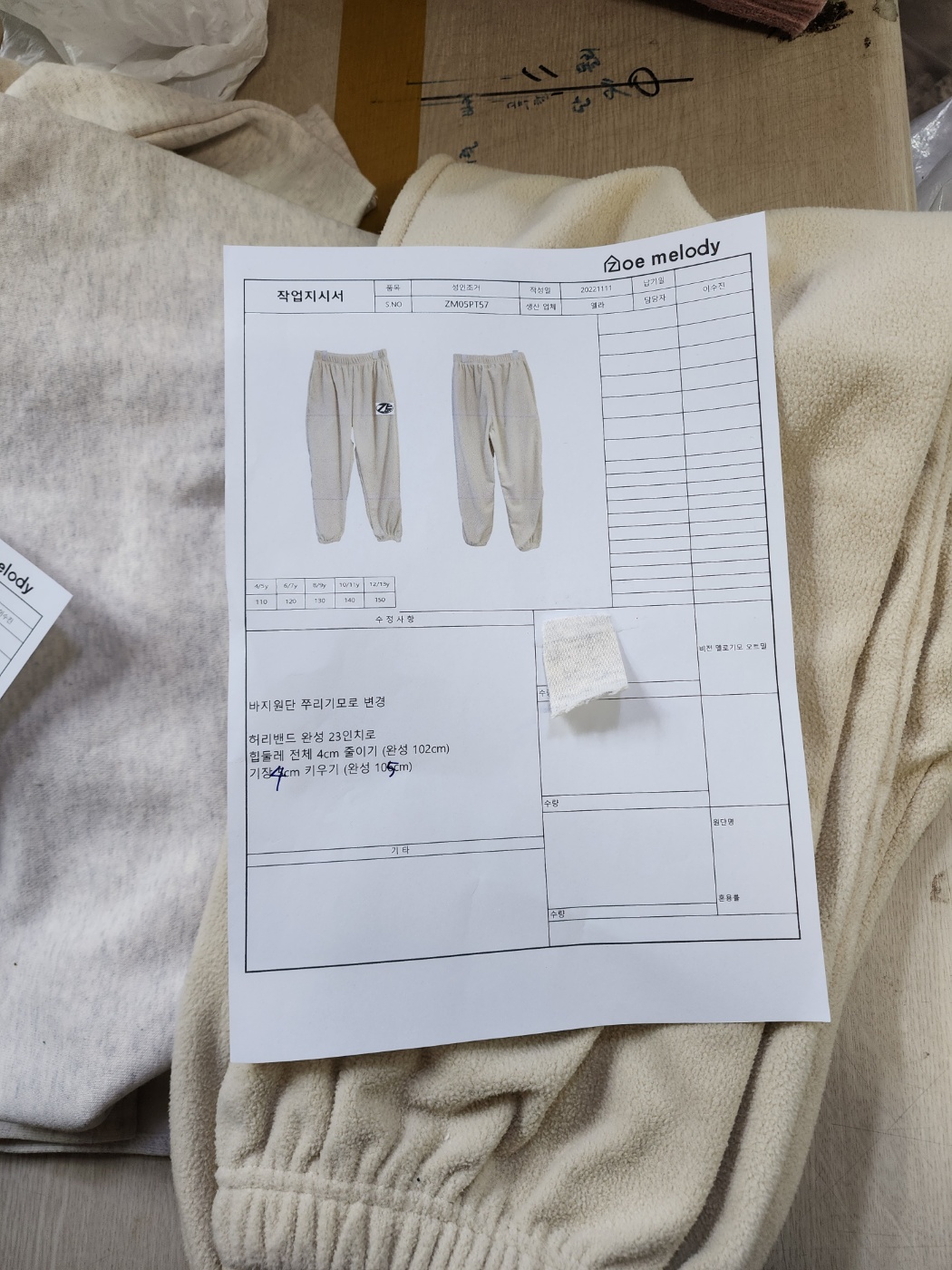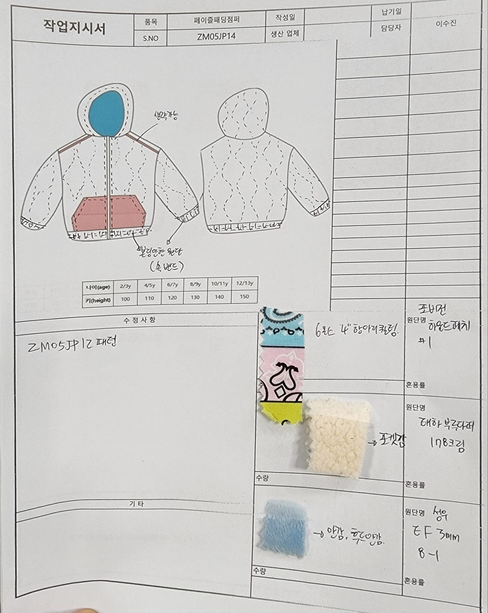 이런 식으로 최종 셀렉된 샘플 원단과 부자재 등을 주문하고