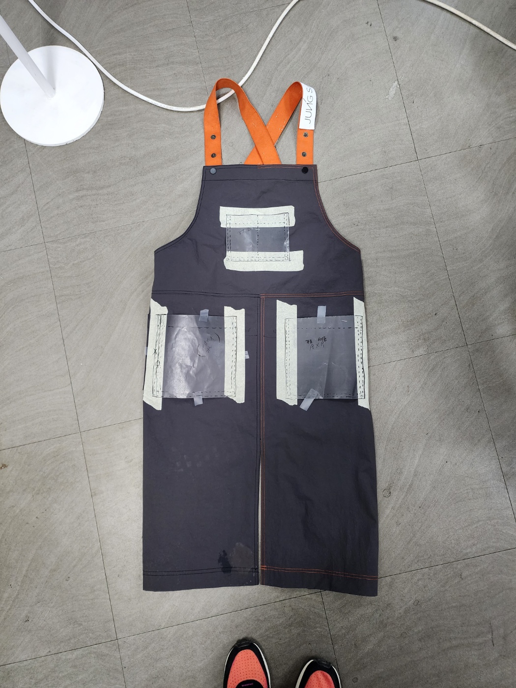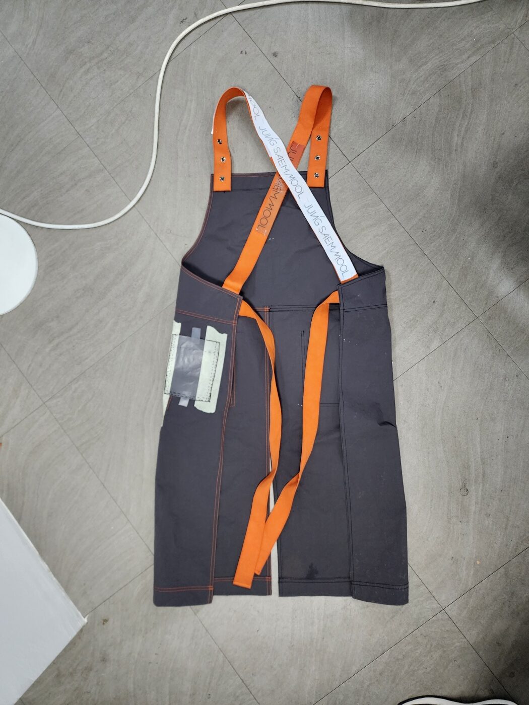 끈이 되는 저 테이프를 염색하고 로고 프린트를 작업하여 더 유니크한 디자인으로 탄생한 앞치마입니다.